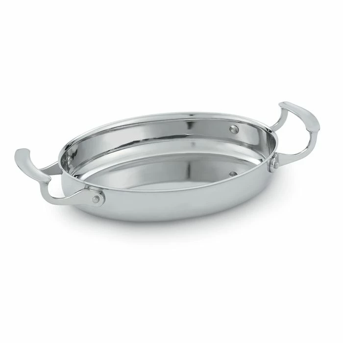 This Miramar® oval pan allows you to baked a cheesy au gratin and serve in the same beautiful pan. The mirror finish exterior makes this pan an attractive serving piece and the stainless steel construction makes it extremely durable.