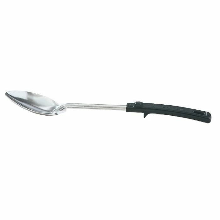 This solid stainless steel basting spoon is 14″ long and the black Grip ‘N Serv® handle is heat resistant up to 230°F and has a thumb notch that will prevent the spoon from sliding into the pan.