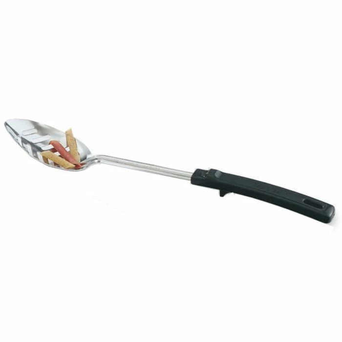 This slotted stainless steel basting spoon features a black Grip ‘N Serv® handle that is heat resistant up to 230°F and has a thumb notch that will prevent the spoon from sliding into the pan.