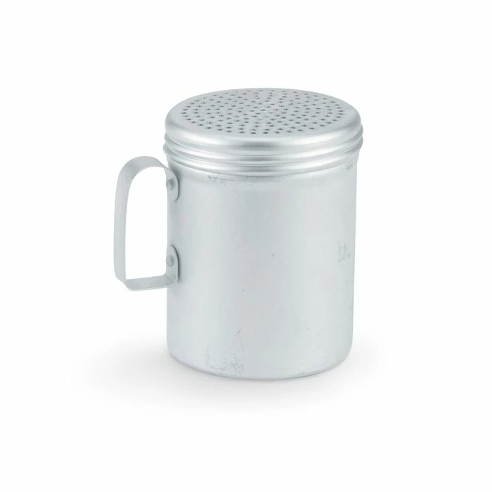 This 10 ounce aluminum dredge is ideal for shaking salt, spices, and powdered sugar and is constructed with 18 gauge aluminum.