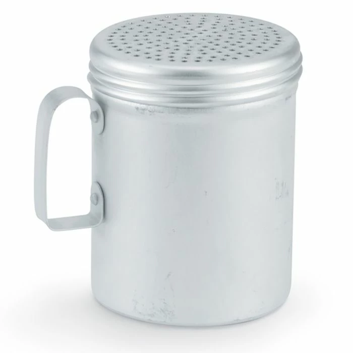 This 10 ounce aluminum dredge is ideal for shaking salt, spices, and powdered sugar and is constructed with 18 gauge aluminum.